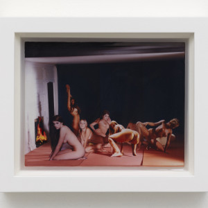 In one photograph titled Jackson Pollock, a woman is splayed out seductively over a canvas of Jackson Pollock’s, where he stands above her, attempting to paint in his infamous drip technique. Using the resin as a form of layering, Simmons creates her own drip technique to further embed the woman into the space and the visage of a muse for painting. In another titled Green Clay Bikini/Piano, a woman is covered by a clay bikini, made by Simmons, and sits in front of a piano while she masturbates. Included are miniatures of a lamp and vase on top of the photographed piano, as well as a tiny piano stuck in caddy-corner positioning by the resin. The indentations these objects make in the material resemble that of plastic packaging with accessories for a doll.